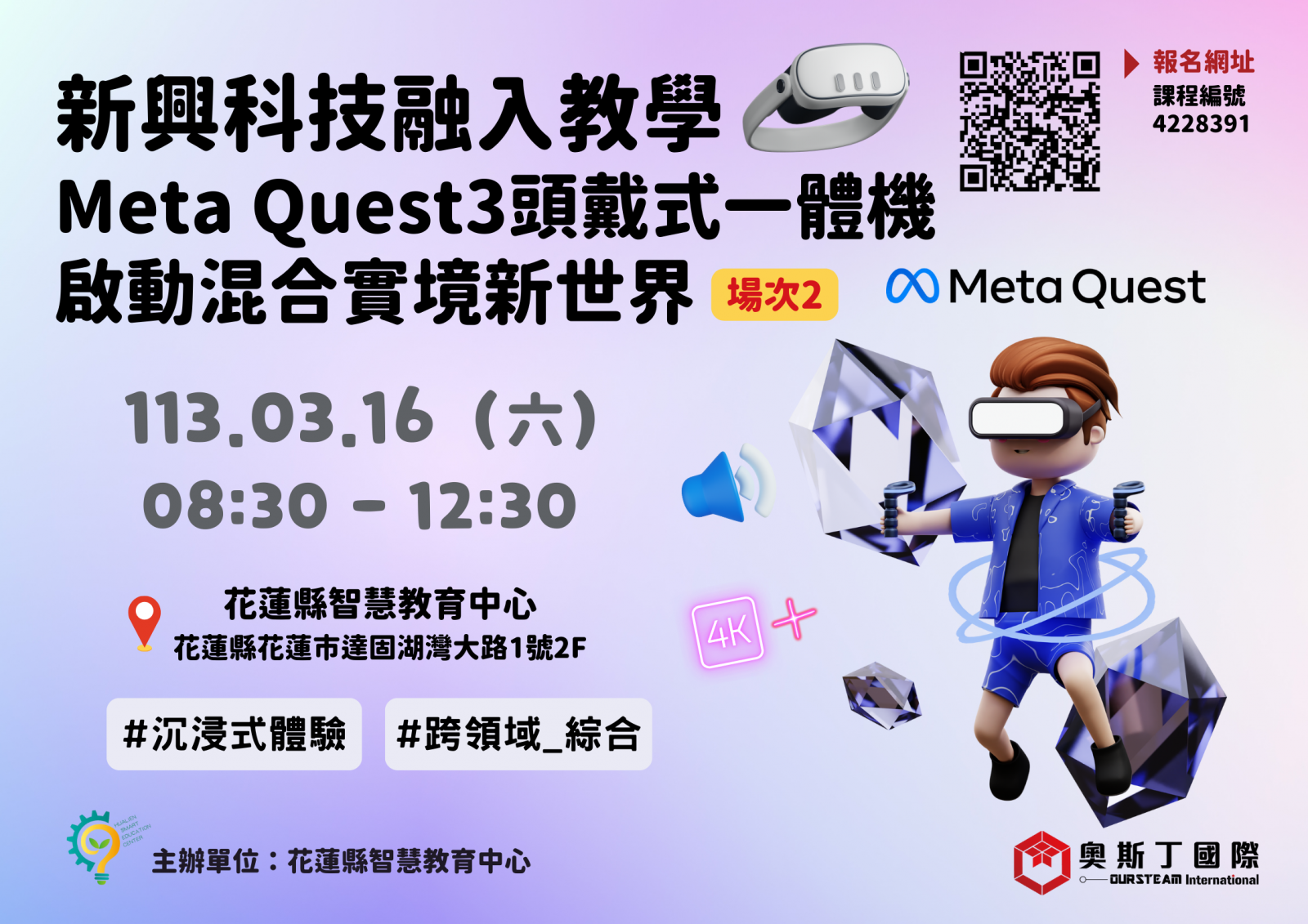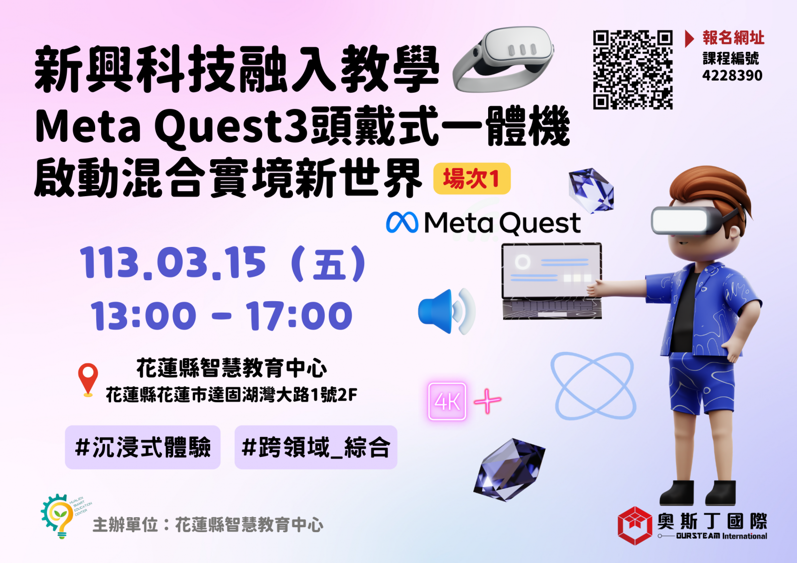 二、 旨揭研習為增進本縣國民中小學數位學習能力,提升教師運用數位科技及資源實施教學之能力,透過Meta Quest3頭戴式虛擬實境一體機實際操作混合實境模式並發展沉浸式體感教學內容,研習資訊如下(共辦理2場次;第1場次為基礎操作及混合實境體驗、第2場次為混合實境體驗及相關教學應用。):