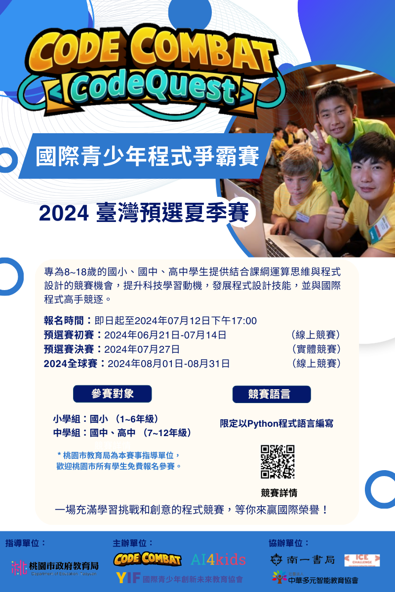 一、 2024年暑假,社團法人國際青少年創新未來教育協會攜手AI4kids、南一出版社、中華多元智能教育協會,為8~18歲的國小、國中、高中學生提供結合108課綱資訊素養的運算思維暨程式設計競賽機會,提升科技學習動機,發展程式設計技能,並與國際程式高手競逐。